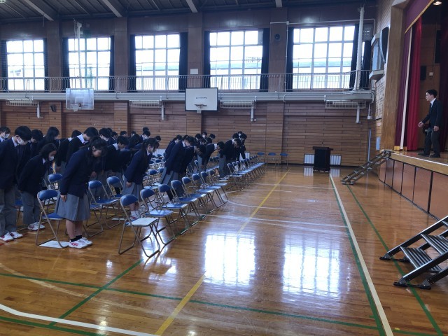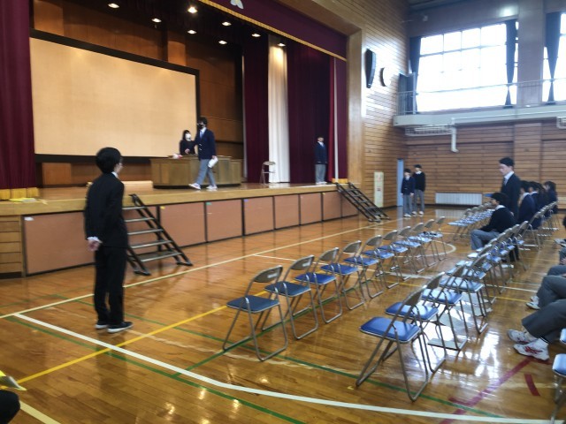 3月5日(木)から今月20日(木)に行われる「卒業式」に向けての準備が始まりました。その様子を2回に分けて紹介します。今回は3年生です。式歌(パート)の隊形になるため、座る場所の確認や卒業証書のもらい方やその他礼法などの所作に関することから始まりました。本番まで数回の学年練習を行い、リハーサルとなる「予行(3月16日 月 実施)」で最終確認をして、本番を迎えます。3年生には、堂々とした態度でこの行事に臨んで欲しいです。