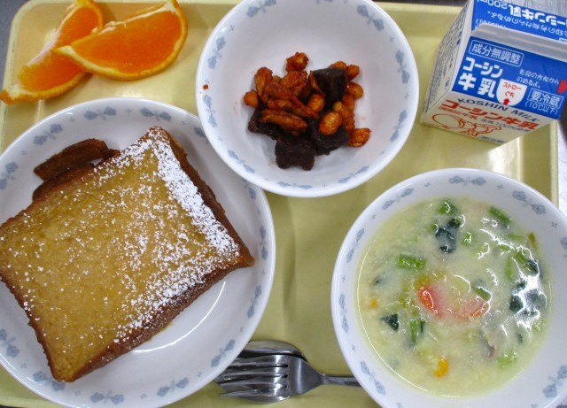 黒糖パンのフレンチトースト 豆乳入りコーンスープ レバーと大豆のマリアナソース デコポン 牛乳