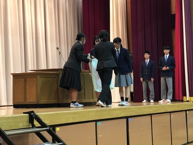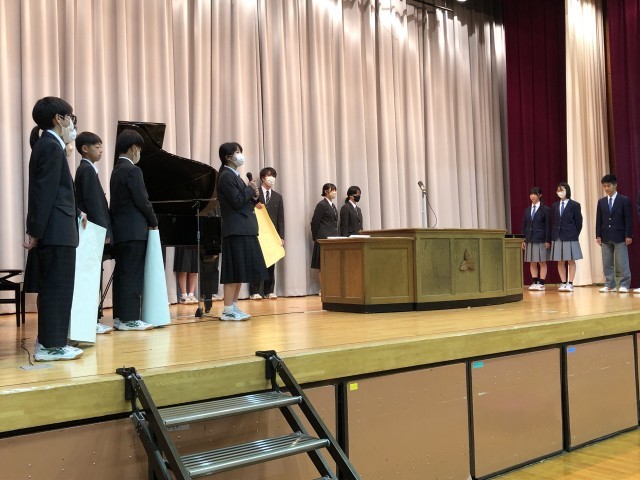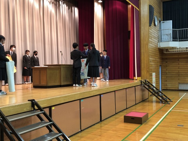 在校生によるお別れセレモニー 公開日 2026/03/22 更新日 2026/03/20 できごと 卒業式予行(3月16日 月)のあと、生徒会によるお別れセレモニーが行われました。各学年が3年(卒業)生に対しての寄せ書きのプレゼントをしました。また、3年生も下級生への寄せ書きをプレゼントをしました。各生徒がそれぞれの思いを文字につづっています。