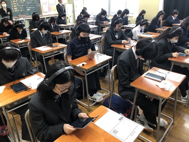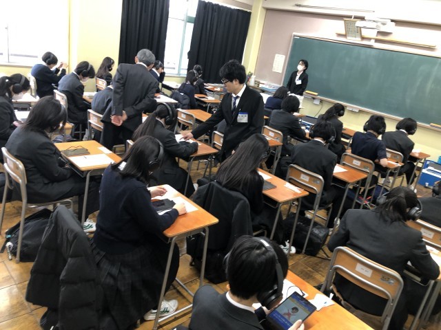 3月2日(月)に1・2年生は英語スピーキングテストを行いました。これは、3年生が11月に行う、英語スピーキングテストのプレテストです。テストの運営は請け負う業者が行うため、生徒も緊張感をもって取り組んでいます。生徒たちは授業で身に付けた表現力(実力)を発揮していました。