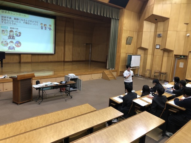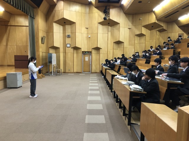 2回目の今回はレインボーホールでの授業形態です。本校のホールは130名程度収容できるので、学年集会や学年一斉授業など、様々形態の授業を展開しています。生徒たちのさらなる学びを願っています。