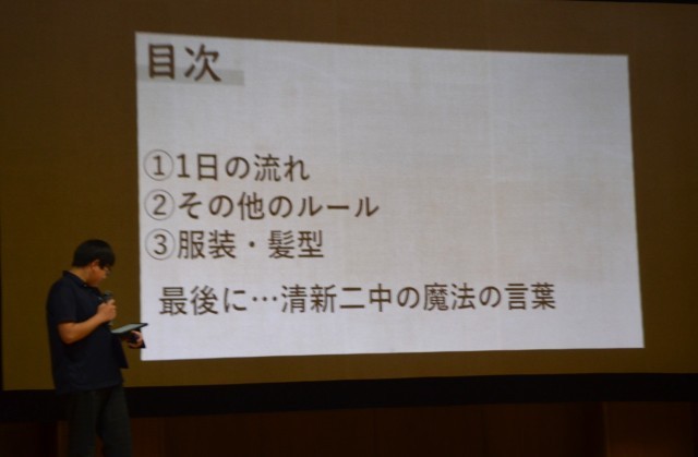 全体学活 公開日 2026/04/09 更新日 2026/04/09 できごと 4月8日(水)の1校時に生徒会主催の全校学活が行われました。校則など学校生活全体に関することについて、生徒会本部役員が説明をしました。寸劇が入ったり、スライドを工夫したりととても分かりやすいガイダンスとなりました。全体での確認、新入生への歓迎など良いムードで学校がスタートしたように感じました。