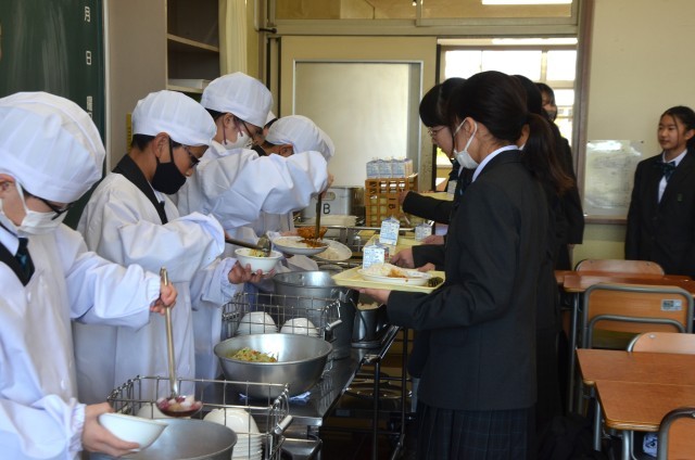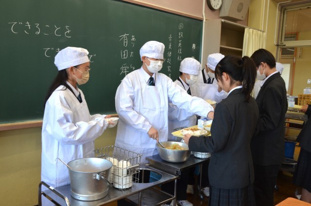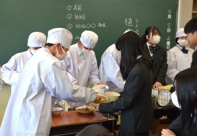 中学校での初めての給食 公開日 2026/04/10 更新日 2026/04/09 できごと 1年生の給食準備(給食当番のよる配膳)の様子です。中学校での初めての給食でした。メニューは一昨日のホームページで紹介されています。各クラスが手際よく配膳がなされていて、よかったと思います。