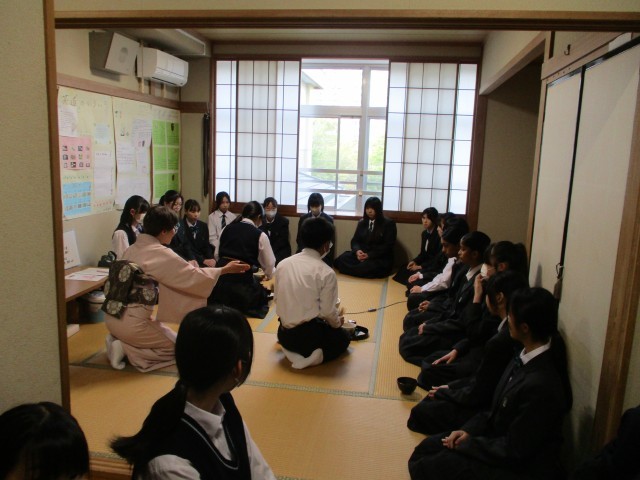 部活動仮入部(茶道部)の様子です。指導は外部の方にお願いしています。