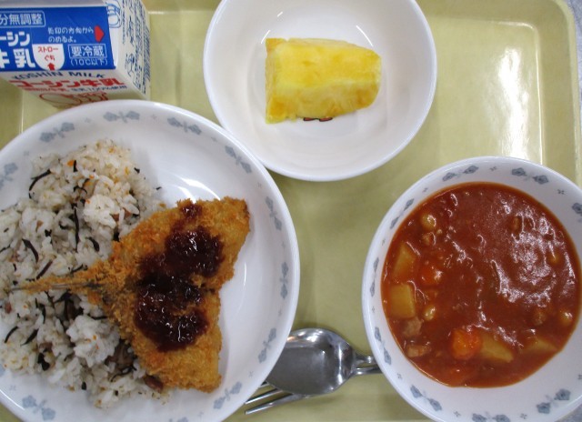 ひじき入りガーリックライス あじフライ 大豆の洋風煮込み パイナップル 牛乳