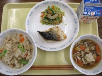 ごはん・のりの佃煮・タラのれんこんバーグ・竹輪入り小松菜サラダ・みぞれ汁・牛乳