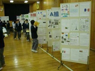 8時20分から展示見学が始まりました。手前味噌になりますが、小さな学校の割には作品が多いと思います。各教科の他、林間学校や修学旅行、部活など多彩な作品が並びます。生徒たちも友達の意外な才能に驚いていました。