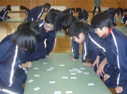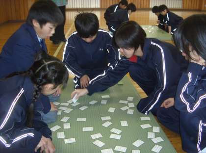 1月28日(金)5、6校時を利用し、国語科に指導してもらい百人一首大会を行いました。グループ分けを工夫したのでどの班でも熱戦が繰り広げられました。
