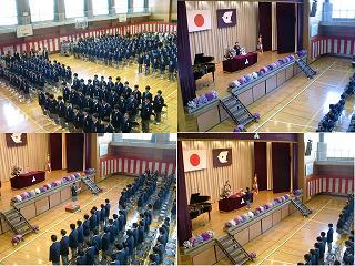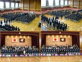 来賓祝辞の後、在校生歓迎のことば(中央左下)、新入生誓いのことば(中央右下)、教職員紹介、校歌紹介と続き、新入生の退場(右上段)で閉会しました。右下段は集合写真です。