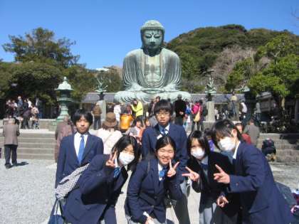 3月4日(金)2年生が鎌倉遠足に行ったきました。当日はお天気にめぐまれ絶好の遠足日和となりました。東西線が安全点検で遅れものすごい混雑しましたが、歴史の街鎌倉では生徒たちは男女仲良くしっかりと班行動ができました。歩き疲れ陽にも焼けて帰りの電車の中はみんな静かに熟睡していました。