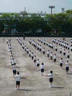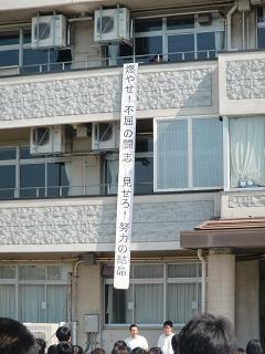 夏のような日差しの下、5月7日(月)の1校時に初めての運動会全校練習が行われました。練習に先立ち朝礼が行われ、卓球部の団体準優勝、ダブルス優勝、シングルス3位(2名)、ソフトテニス部の個人戦5位(ダブルス)が表彰されました。また、運動会のスローガンが生徒会本部によって発表されました。今年のスローガンは「燃やせ!不屈の闘志 見せろ!努力の結晶」です。続いて運動会の色分け抽選が男子学級委員によって行われ、1A、2A、2B、3Aが青組、1B、2C、3Bが赤組に決まりました。そしていよいよ運動会の練習が始まりました。初練習のこの日は足踏み(行進の練習)と体操でしたが、残念ながら全員が本気を出しているとは思えない出来でした。本番まで何回も練習があるわけではありません。特に3年生にとっては最後の運動会です。1、2年生をリードして、悔いのない運動会にして欲しいと願っています。