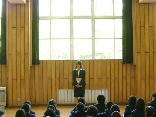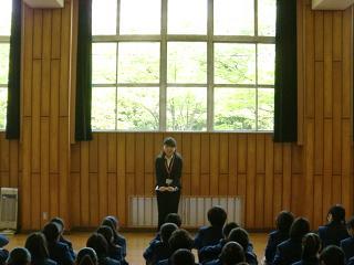 5月14日の全校朝礼で、教育実習生の紹介がありました。今年は社会科と保健体育科の二人が、今日から3週間の教育実習に臨みます。教師目指してがんばって欲しいと思います。朝礼の後、担当クラスのある2年生の学年集会に参加しました。今は運動会の練習と重なる時期です。授業以外に生徒達とふれ合う機会を、少しでも多く持って欲しいと思います。