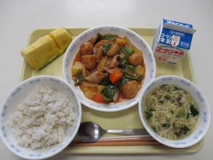 ごはん すり身団子 中華風なめこスープ パイナップル 牛乳