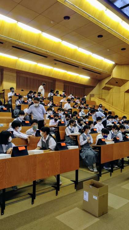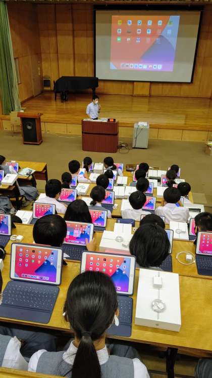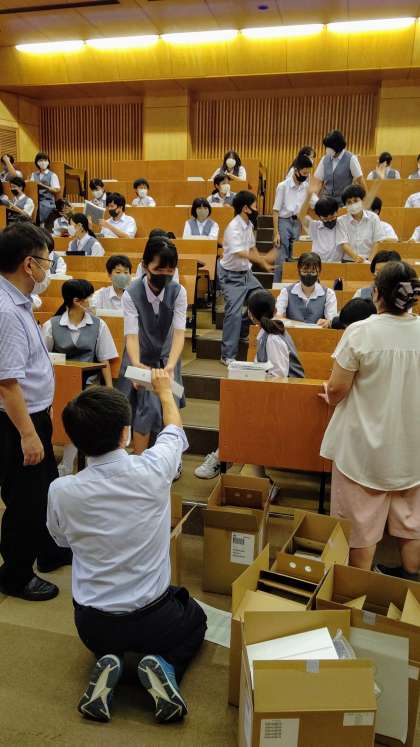 本日6校時、レインボーホールにて1年生にiPad端末を配布しました。これで本校の全生徒にタブレット端末の配布が完了しました。