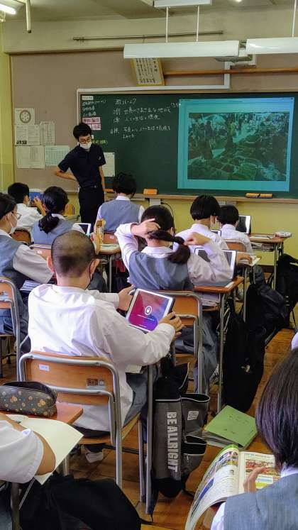 写真1 1年生「社会」地理 世界の様々な地域 iPad端末を活用し、写真や資料から、世界の人々の暮らしぶり等を読み取ります