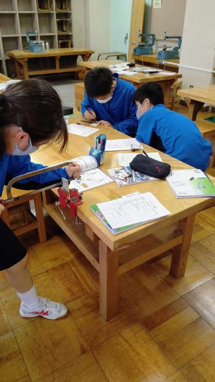 写真2 2年生「技術」ペンスタンドの作製 デザインを終えて、早い生徒は糸ノコギリを使って作製に入っています。