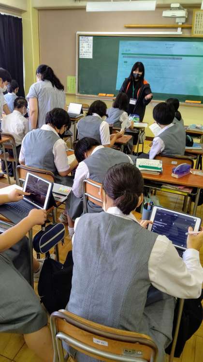写真3 3年生「英語」ALT講師の先生とのT・T(ティーム・ティーチング) iPadの翻訳機能(日本語を英語に変換)を活用して、英会話文を作成。できた文章はiPadが読み上げてくれます。iPad 恐るべしです。