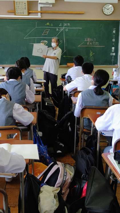 写真1 1年生「技術」 第一角法による正投影図 物体を様々な視点・方法で図面にかき起こす方法を習得します。空間認知力が必要です。