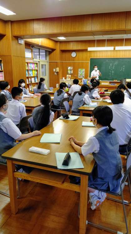 写真2 2年生「国語」読書感想文について 図書室で授業が行われ、三浦綾子さんの「氷点」についての話題が出ました。
