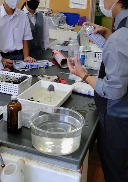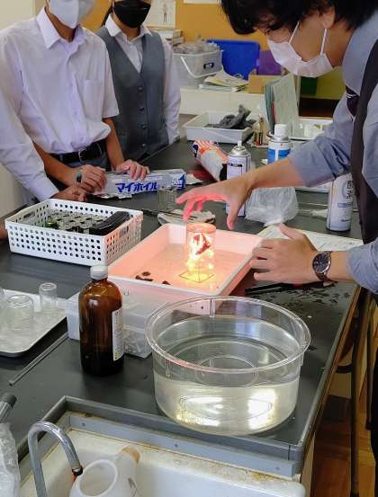 写真1 2年生「理科」物質の化学変化 燃焼(ものが燃える)がどのような化学変化なのか、実験により推論していきます。