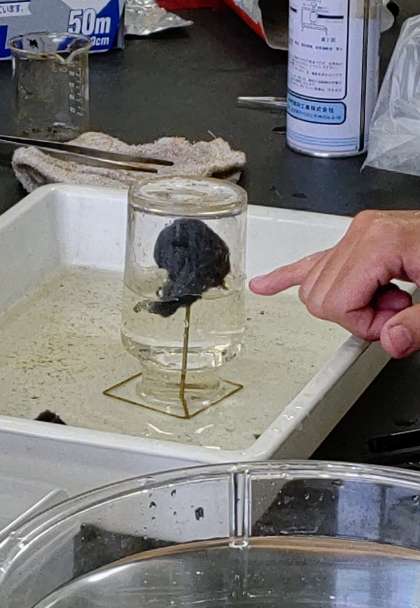 写真3 かぶせた集気ビンにはバットからの水が吸い込まれます。