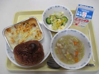 黒砂糖パン じゃがいもとナスのグラタン チーズ入りサラダ ひよこ豆のスープ 牛乳