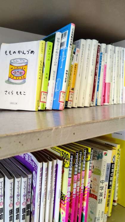 写真2 教室の前の棚にも本が・・学級文庫でしょうか・・担任の先生のお気に入りの本も並んでいます。