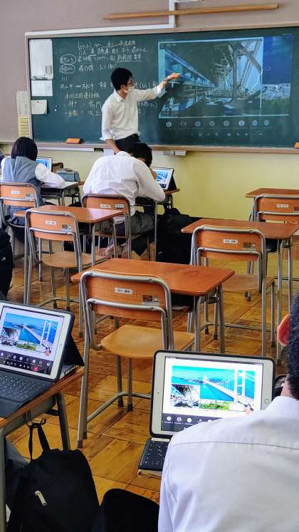 写真1 2年生「社会」四国の交通網 本州四国連絡橋 四国は本州と橋で結ばれたことで飛躍的に生活の利便性が高まりました。