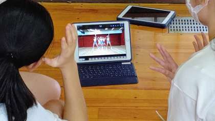 写真3 ダンスの練習にはiPadが大活躍。動画を見ながら動きが確認できます。タブレットの視覚効果は絶大です。