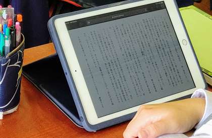写真1 1年生「国語」 蜘蛛の糸(芥川龍之介) iPadを活用し、デジタルの活字を使って学習。