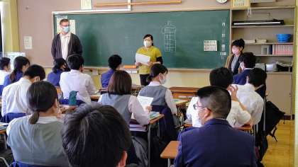 写真3 3年生「英語」 ALTの先生を交えての会話の学習(2学期よりALTの先生が男性の先生に代わりました。とても背の高い先生です)