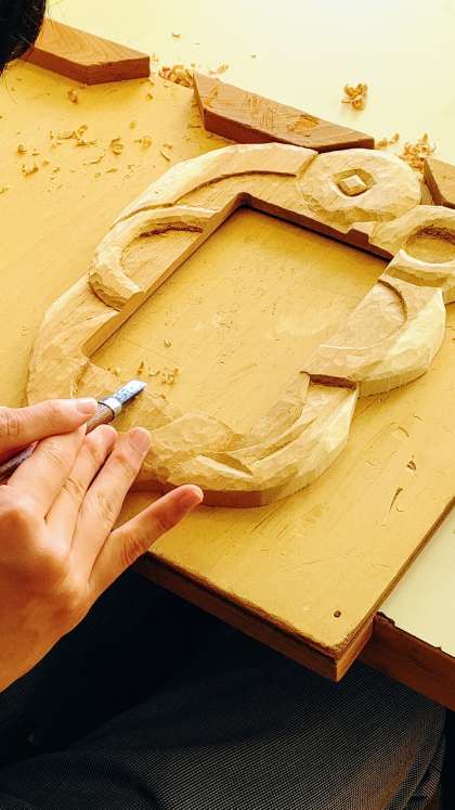 写真2 3年生「美術」木彫 鏡(ミラー)の飾り枠の制作 中央に四角い鏡をはめ込みます。