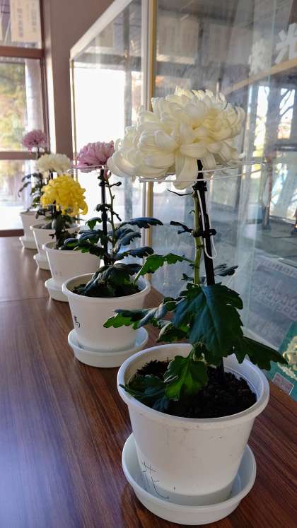 写真3 3年生「技術」菊の栽培 福助(品種名)が大きな花を咲かせました。昇降口に展示しています。