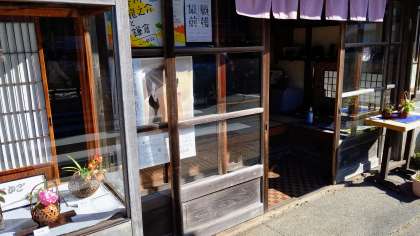 写真2 一本路地に入ると、古めかしいガラスの引戸のお店が・・。
