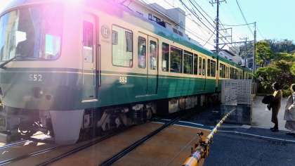 写真3 江ノ電の昔ながらの緑色とクリーム色のツートンカラーの車両。この日は4両車両の電車が走っていました。