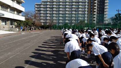最後に、マラソン大会を見守っていただいたPTA本部役員・保護者ボランティアの皆様に、感謝の意を込めて生徒全員で礼をしました。有難うございました。