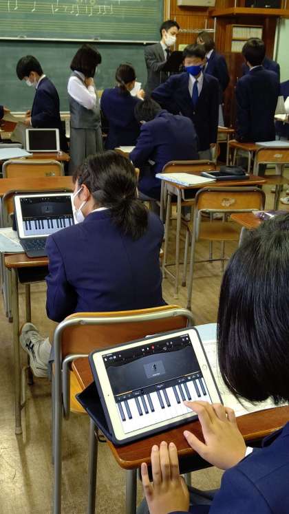 写真1 1年生「音楽」 作詞・作曲にチャレンジしよう!  生徒一人ひとりが思い思いにiPadを使って楽しい曲を創ります。