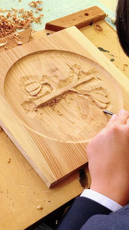 写真1 1年生「美術」飾り盆 慎重に 丁寧に かつ大胆に彫り進めます。