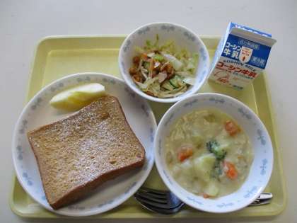 黒糖パンのフレンチトースト 魚介のクリーム煮 大豆のぽりぽりサラダ りんご 牛乳