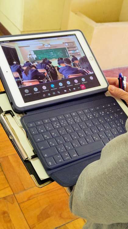 写真2 テーマ1として、ICT機器を活用しての「遠隔授業の推進」です。iPadタブレット用スタンドを教室後方に設置し、授業を配信しました。