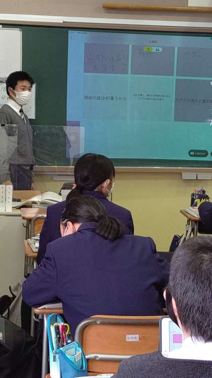 写真2 そして生徒は火山の形のちがいをすぐに付箋(電子付箋)に書き留め、瞬時に先生へ送信します。