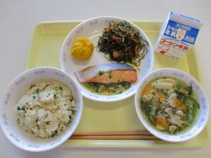 12月22日(水)の給食 公開日 2021/12/23 更新日 2021/12/23 給食 今日は冬至の献立でした。 大根めし 鮭の柚庵焼き 切り昆布の炒め物 かぼちゃとさつまいもの茶巾 豚肉と白菜のすまし汁 牛乳 冬至にかぼちゃを食べてユズ湯に入ると、風邪をひきにくいといわれています。
