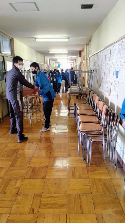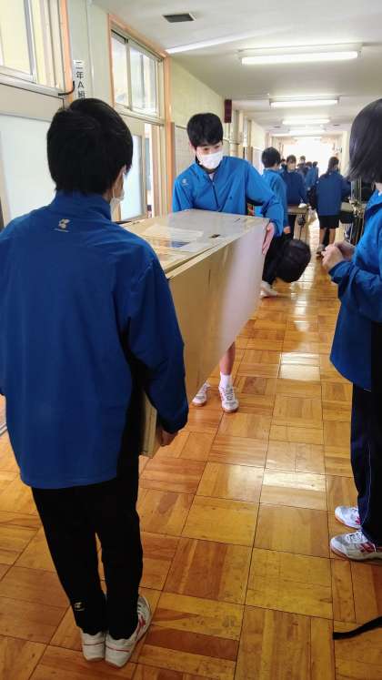 写真1 学期に一度の大掃除。教室にある物品をすべで一旦廊下に出します。