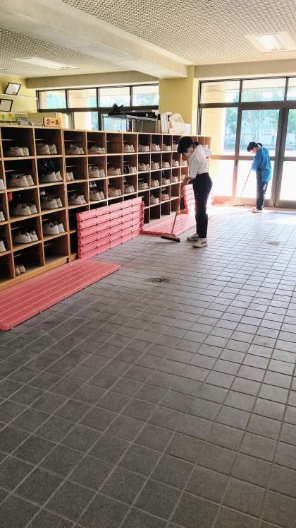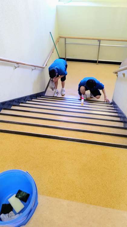 写真3 夏休みに主事さんがワックス掛けをしてくれた階段。しっかりときれいにします。