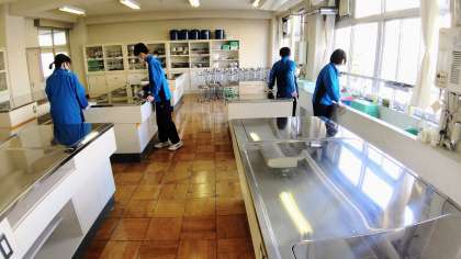 写真1 特別教室「調理室」もきれいに。早く調理実習ができるとよいのですが・・。