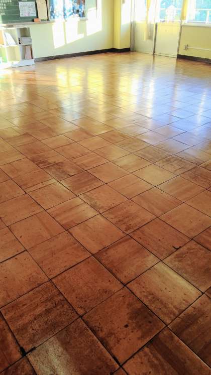 写真3 最後にワックスを掛けてくれました。明日の朝には乾いています。机・イスを入れて最後の学活を受けてください。