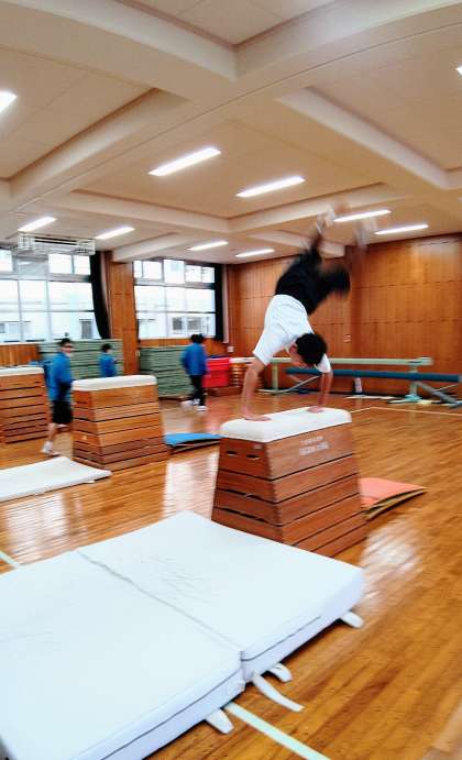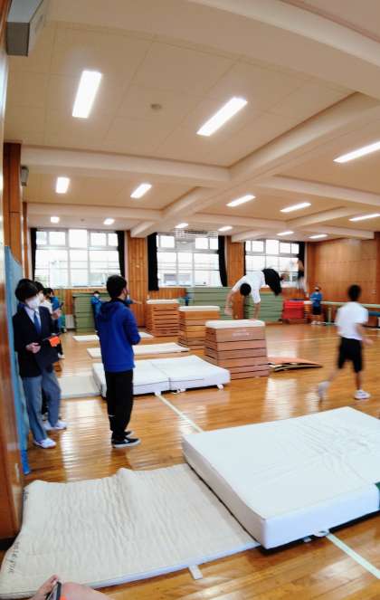 女子はマット運動、男子は跳び箱です。器械体操は、技の難易度、美しさ、安定性が評価される競技です。