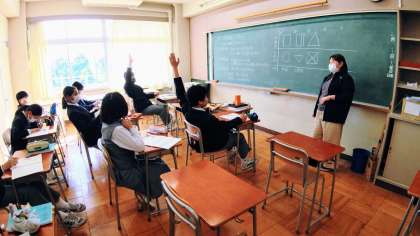 写真1 1年生「数学」図形 少人数で取り組んでいます。少人数だからこそ、先生との会話もスムーズです。