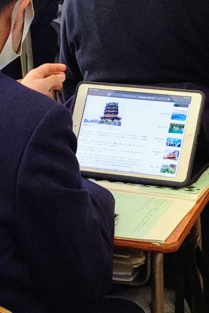 写真3 3年生「国語」漢詩を味わう 李白や杜甫の漢詩を味わい、作者の心情や表現の工夫を話し合う。国語もiPadを活用します。