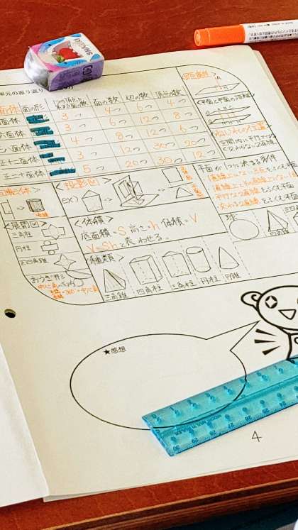 写真1 1年生「数学」空間図形 図形の学力を身に付けるためには、具体的なイメージを頭の中で構築することが大切です。綺麗にプリントを仕上げています。